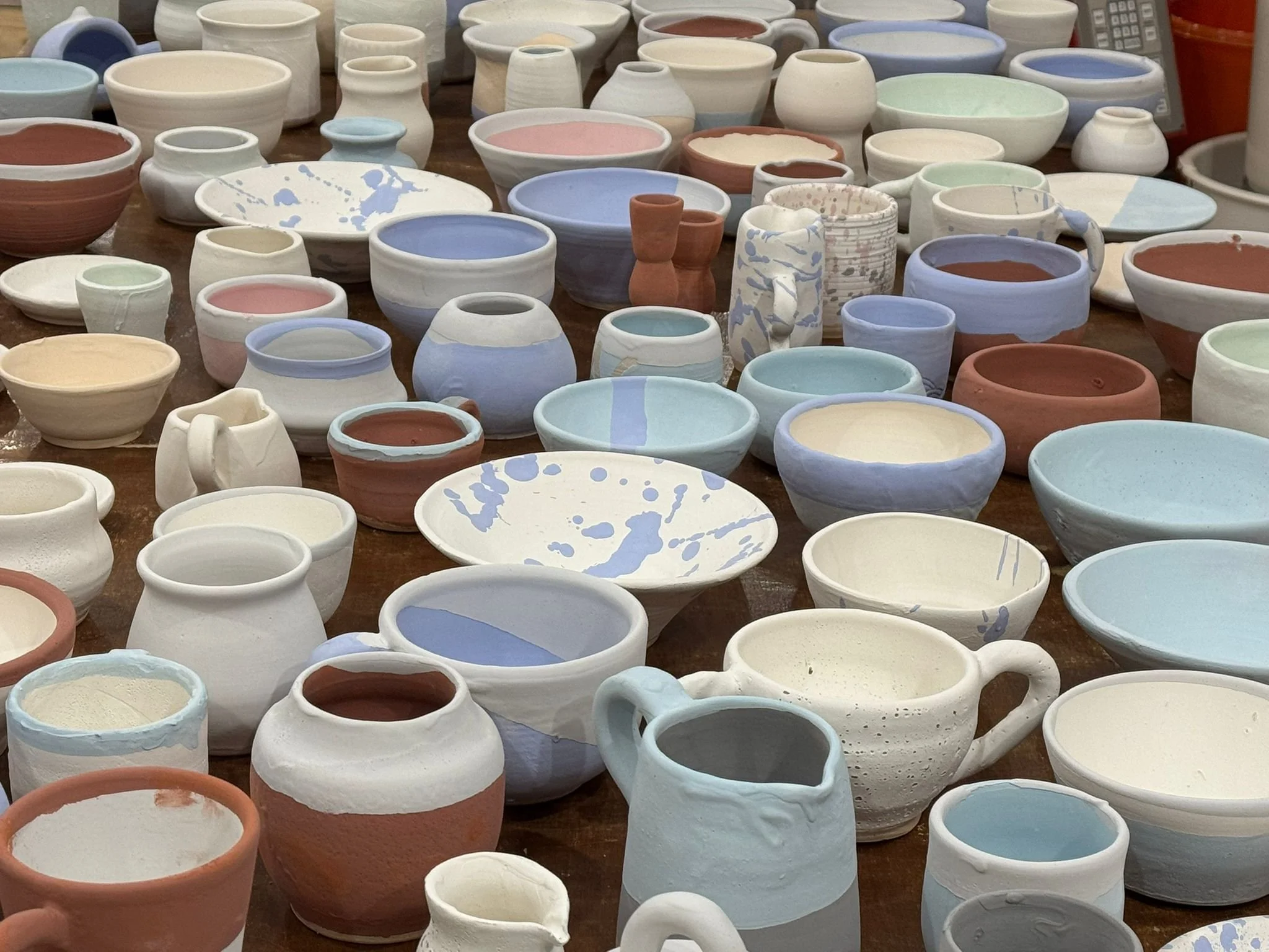 Glazed student work ready for firing — the final stage before pieces become food-safe and complete.